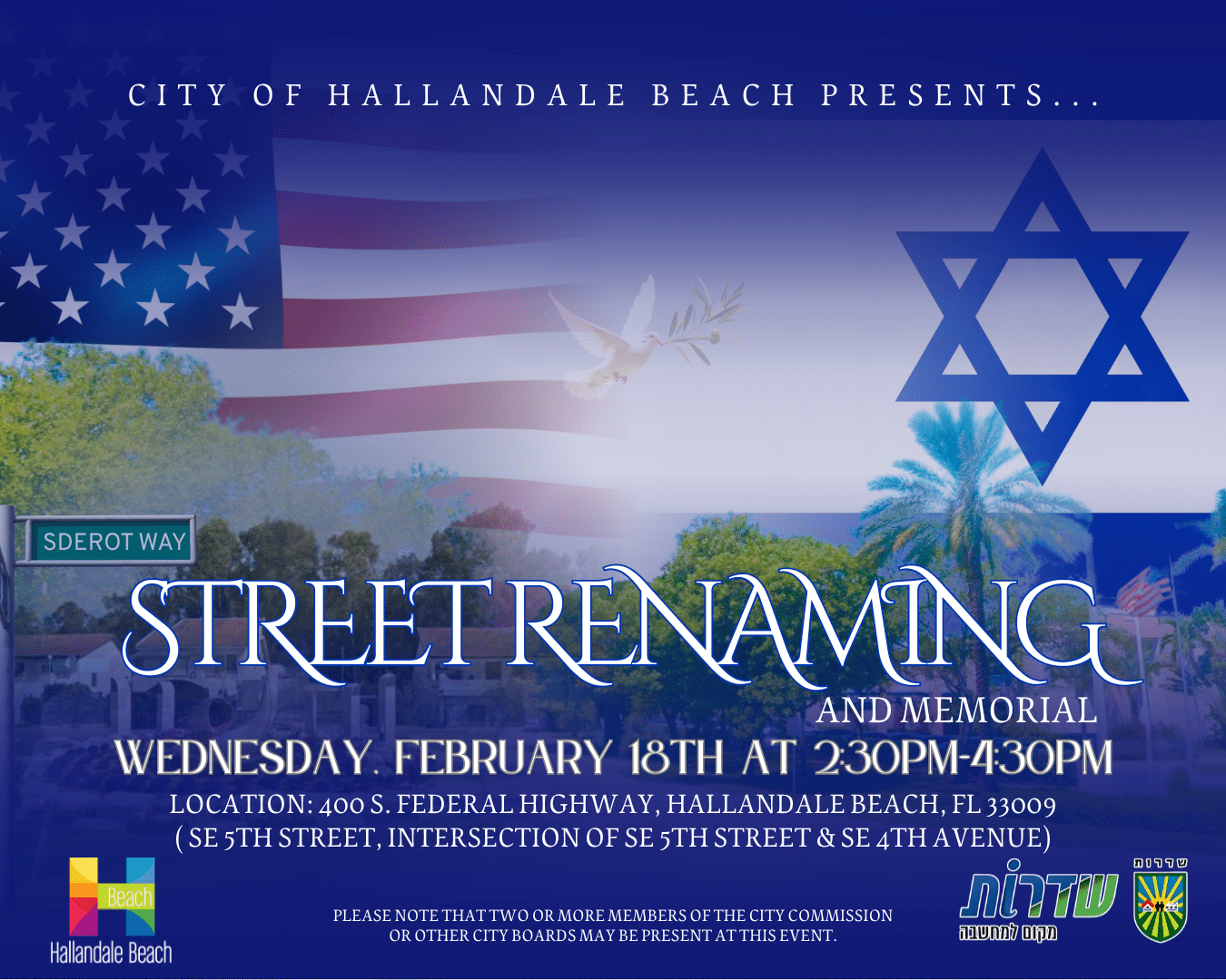 On behalf of myself, Mayor Joy Cooper of the City of Hallandale Beach, I am honored to invite you to a special Street Renaming Ceremony & Memorial commemorating our cherished sister-city relationship with Sderot, Israel and the memorial commemorating October 7th.