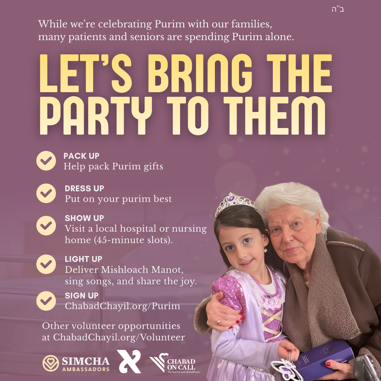 Let’s bring the joy of Purim to those who would otherwise be spending it all alone. Help pack Purim gifts or give them out. Help put up a Purim skit or sing a song. Flexible dates and times. Sign up at ChabadChayil.org/Purim and begin sharing the joy.
