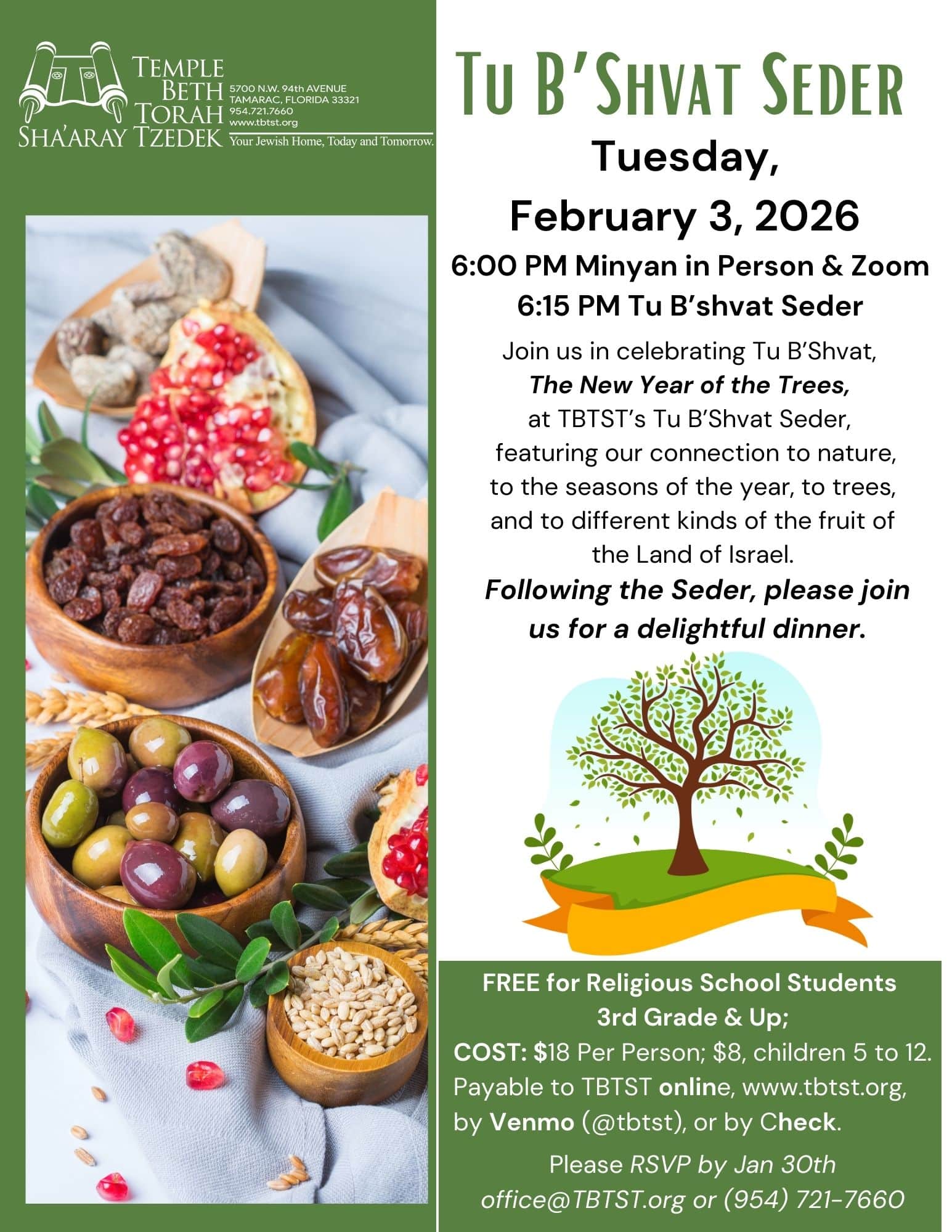 Join us in celebration The New Year of the Trees as Temple Beth Torah Sha'aray Tzedek's Tu B'Shavat Seder, featuring our connection to nature, the seasons and the fruit of Israel. Dinner will be served following the Seder. $18 per adult, $8 children 5-12