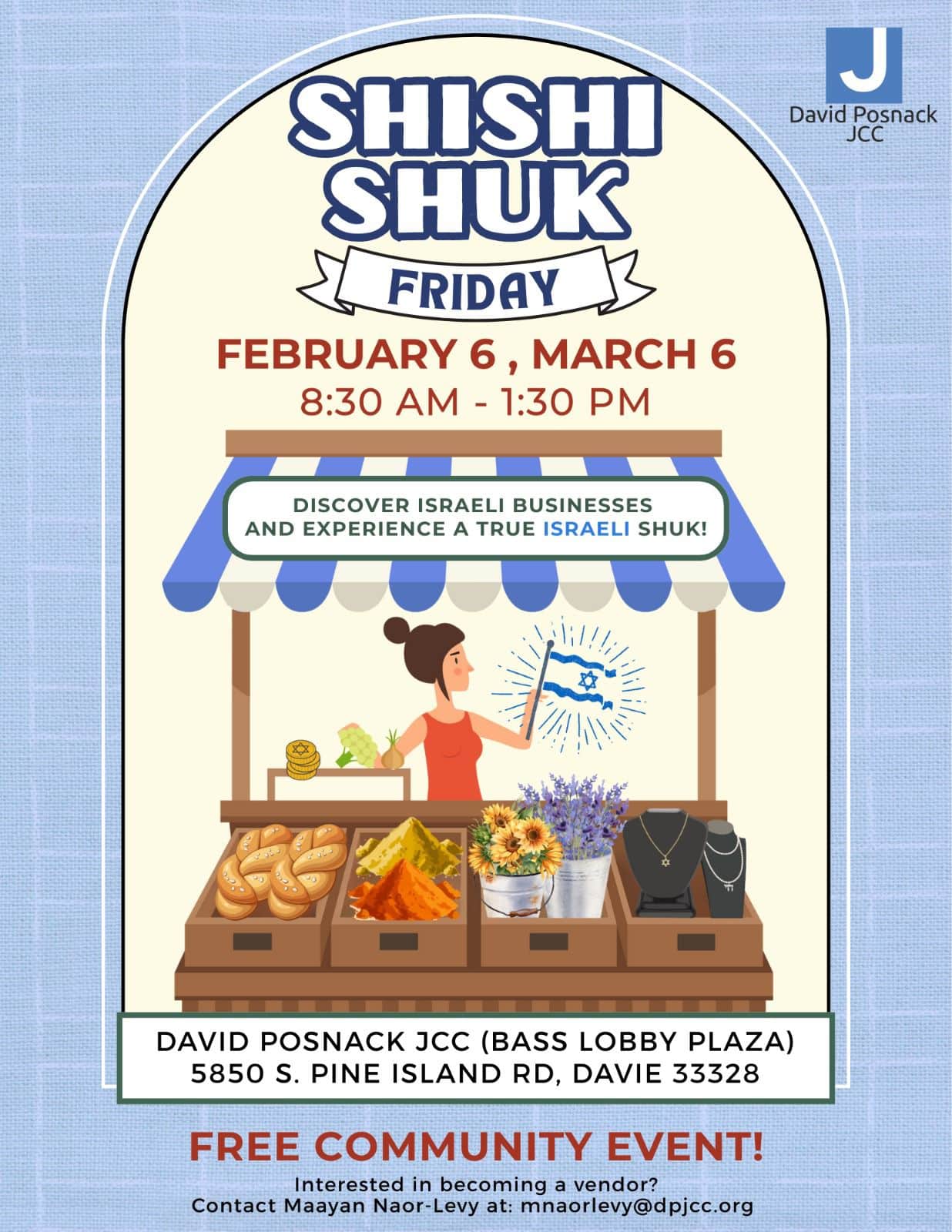 Shishi Shuk is back at the David Posnack JCC! Experience the sights, sounds and flavors of Israel, right here in Davie. Shop local Israeli vendors, enjoy delicious food, discover handmade goods and soak in the Shuk vibes with friends and family. Come stroll, shop, snack and stay a while! The J is your marketplace!